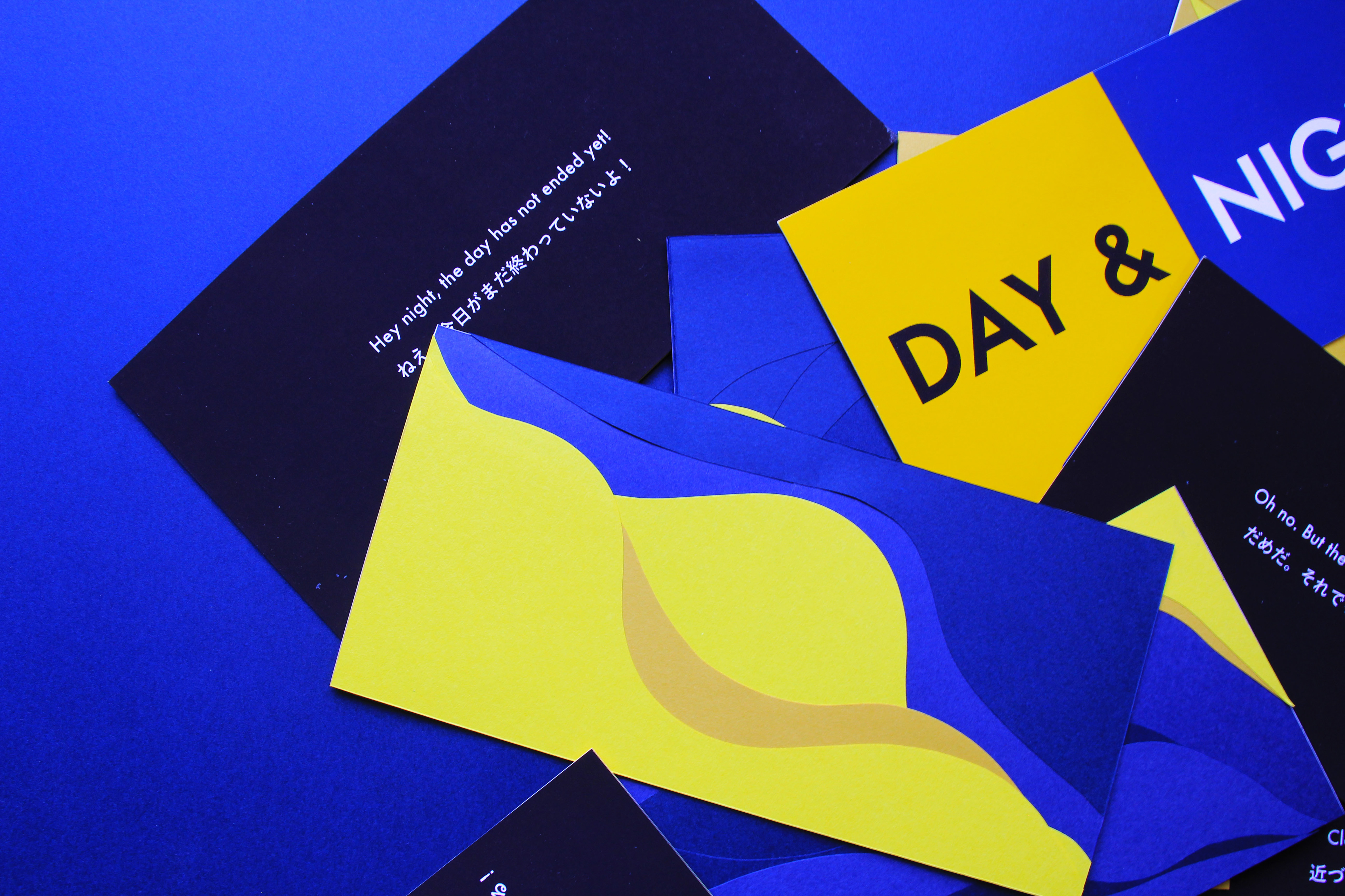 DAY&NIGHT は朝から夜に変わる一日の流れを話す物語である。晴れた朝から始まり、だんだんと夜が来て、朝は「まだ朝でいたい」と言って夜と戦う。時間は過ぎていくものなので、最終的には夜が訪れてくる。