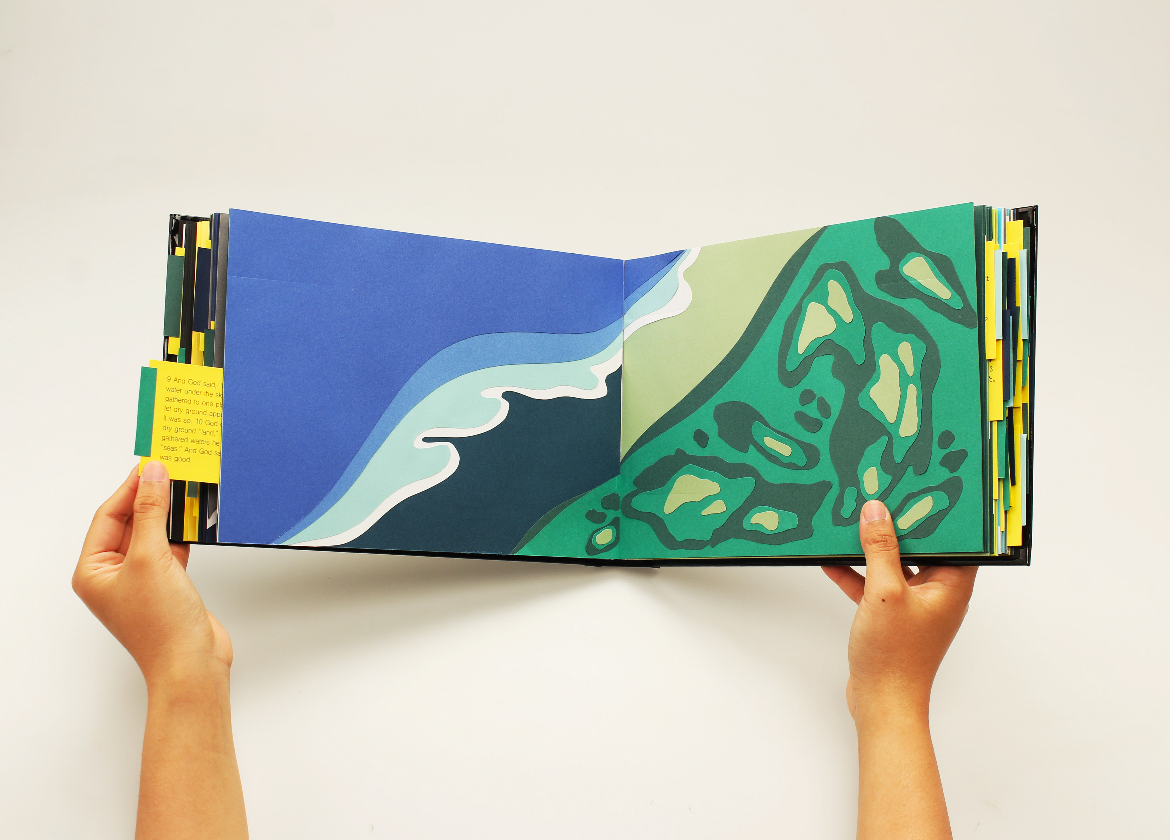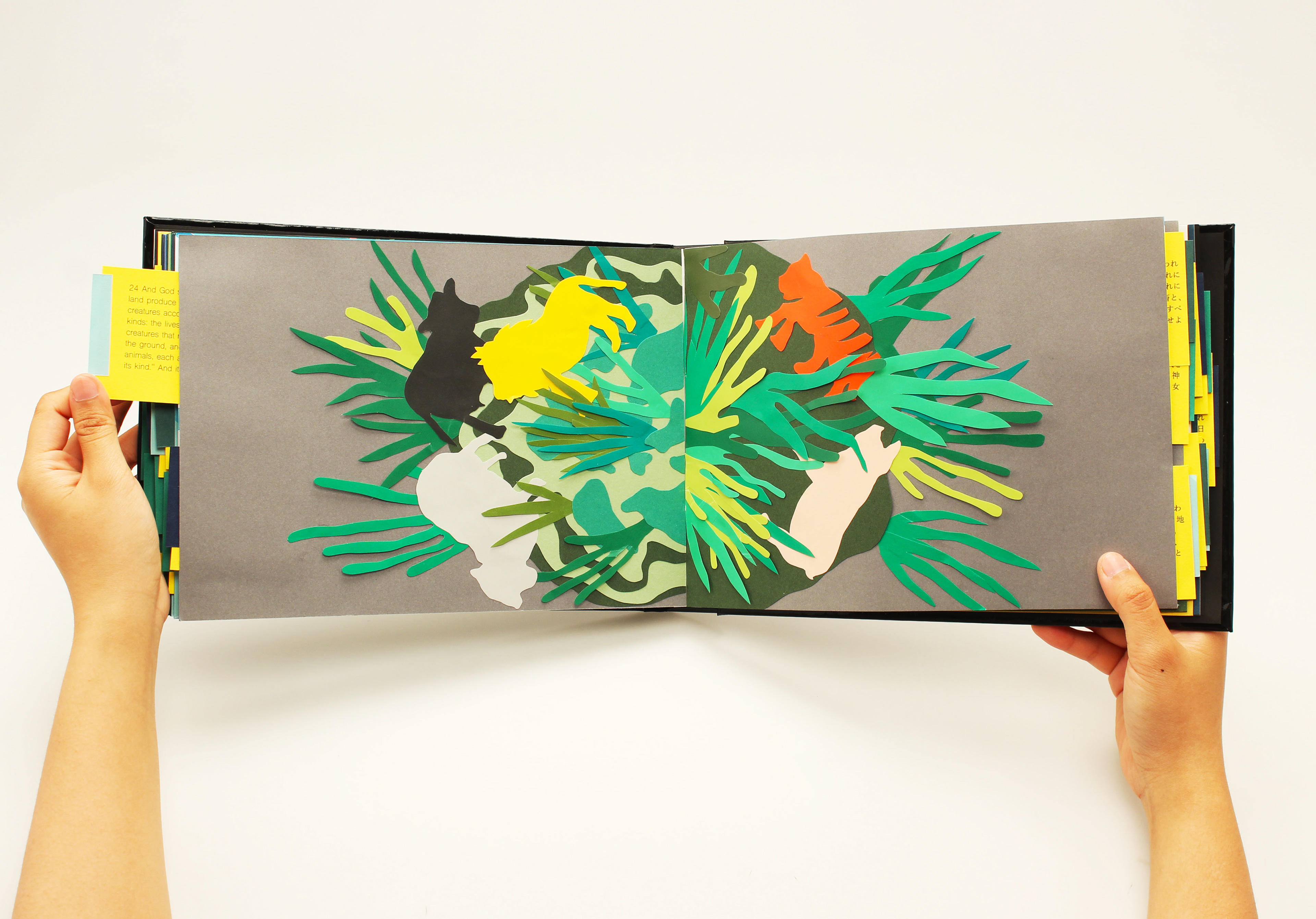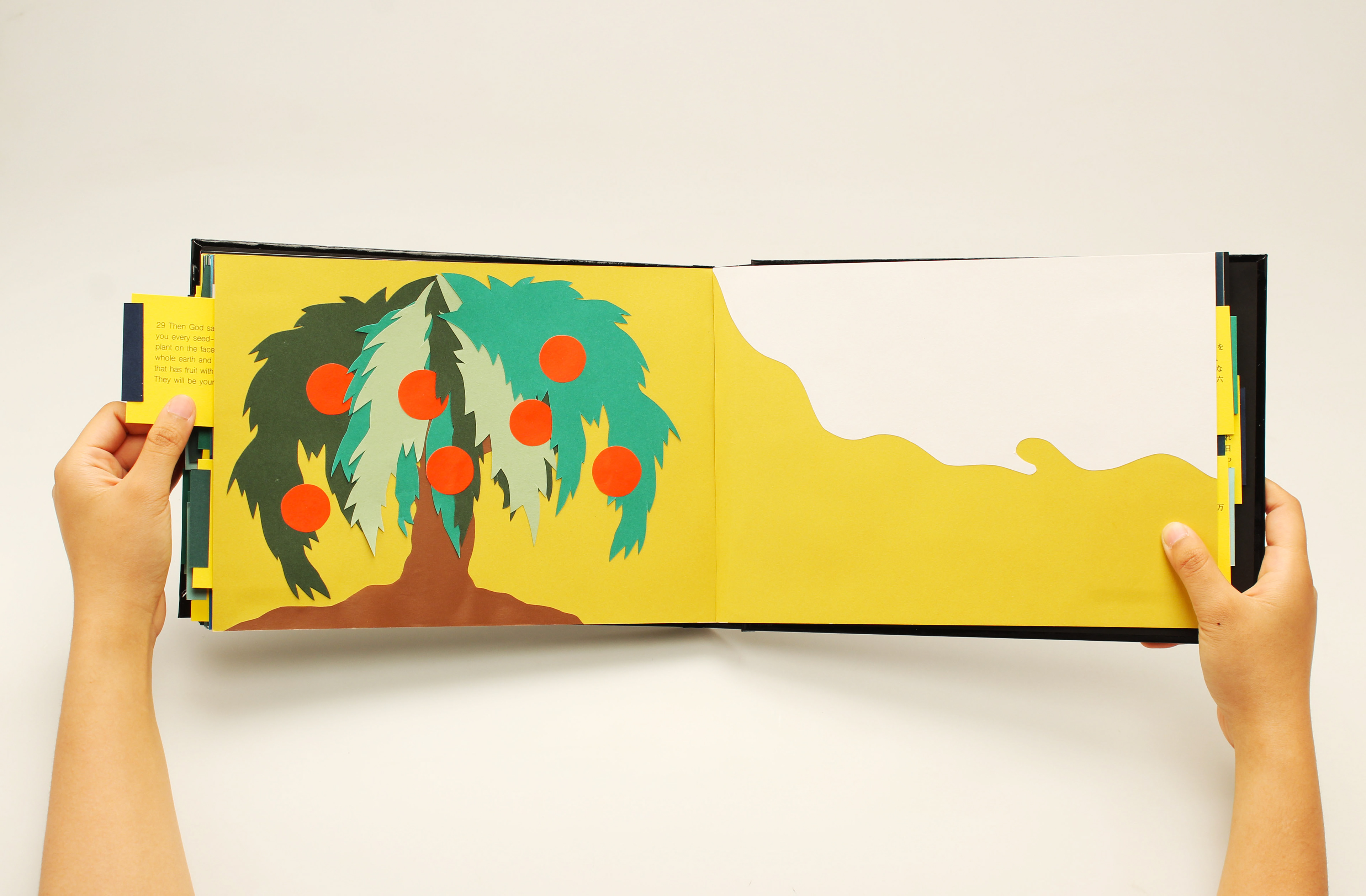 All things on Earth are beautifully harmonized. Humans can’t control the growth of nature or the flow of time because only God can. God created the universe, earth, nature, human beings for a purpose. This work illustrates the birth of the planet from God’s point of view. The colored papers are cut into fine shapes and layered into a three dimensional art book.