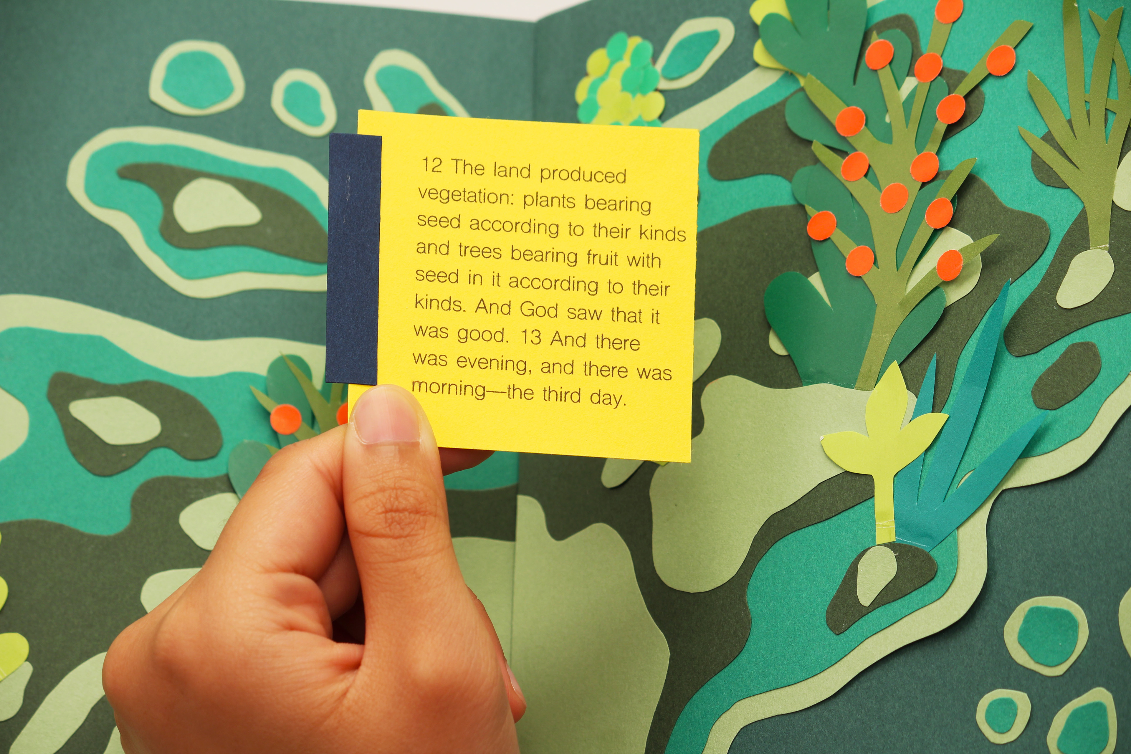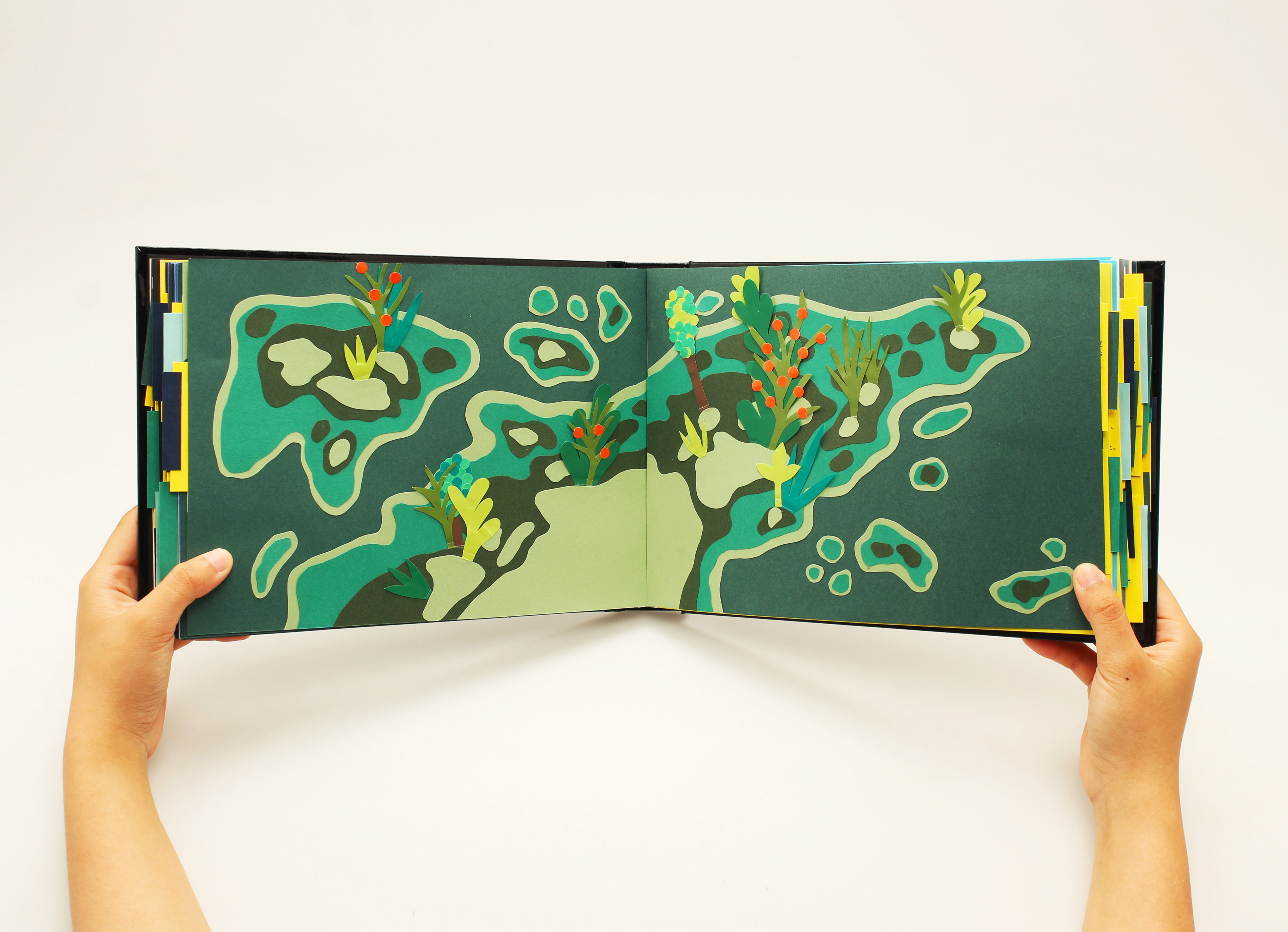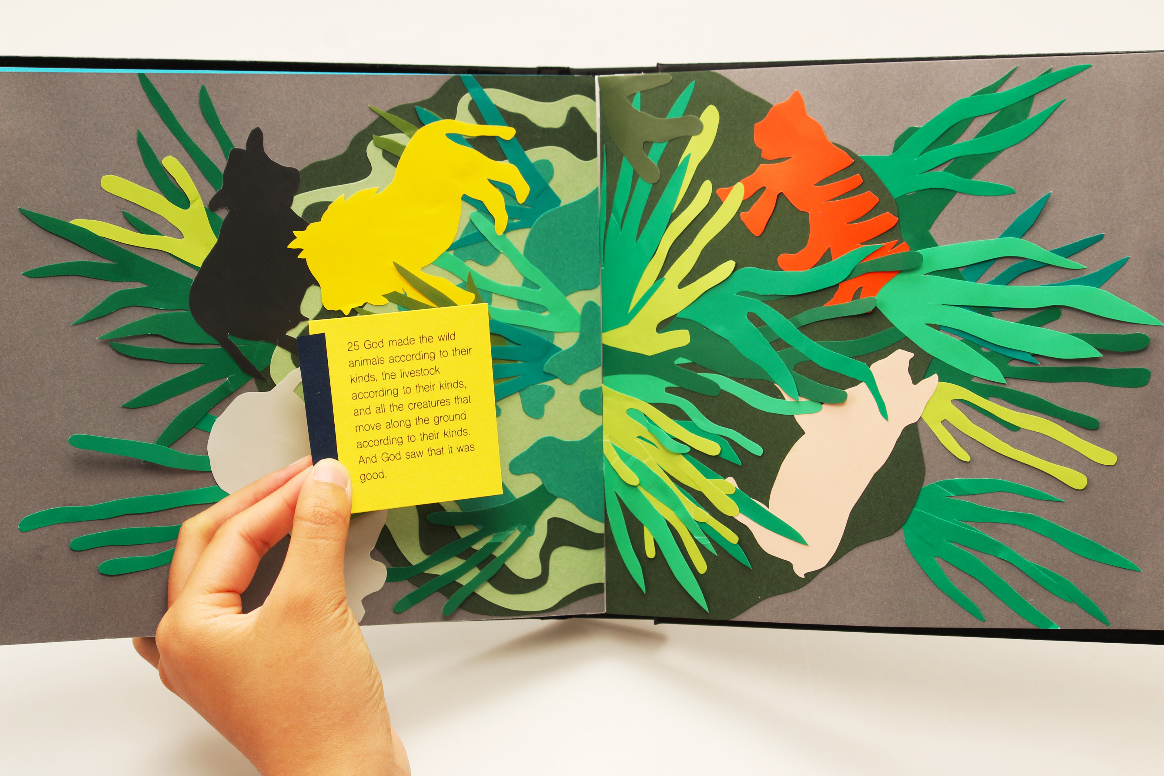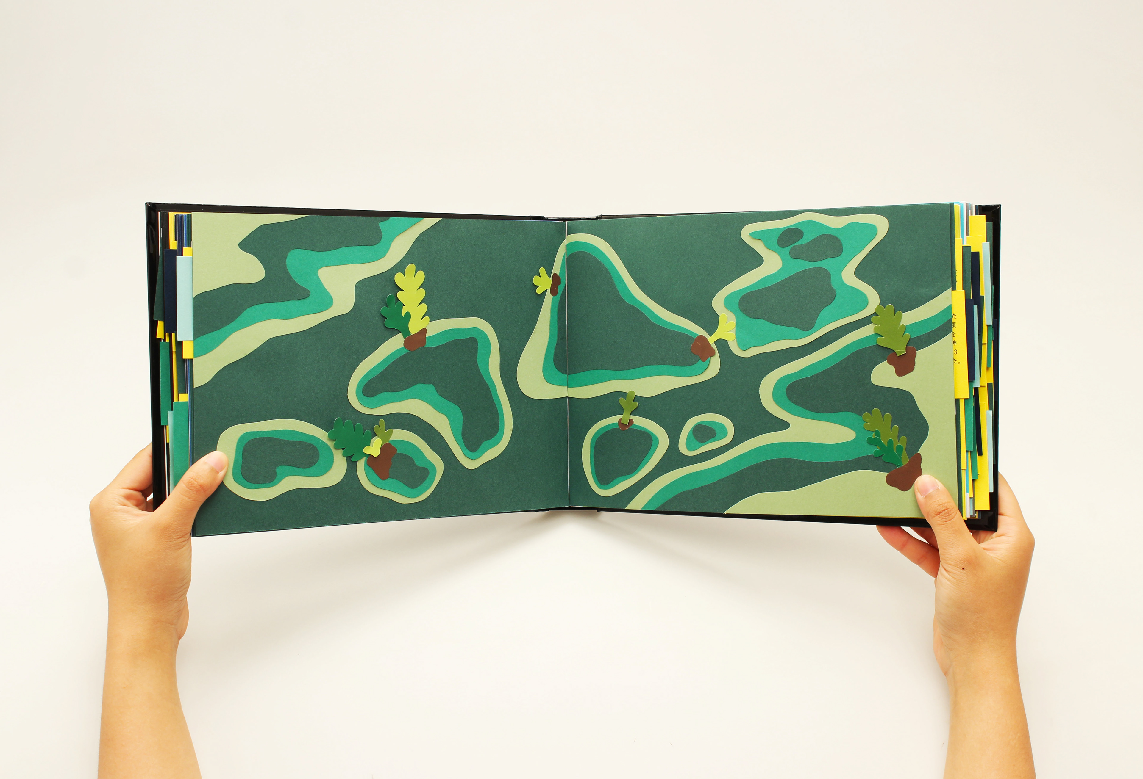 All things on Earth are beautifully harmonized. Humans can’t control the growth of nature or the flow of time because only God can. God created the universe, earth, nature, human beings for a purpose. This work illustrates the birth of the planet from God’s point of view. The colored papers are cut into fine shapes and layered into a three dimensional art book.