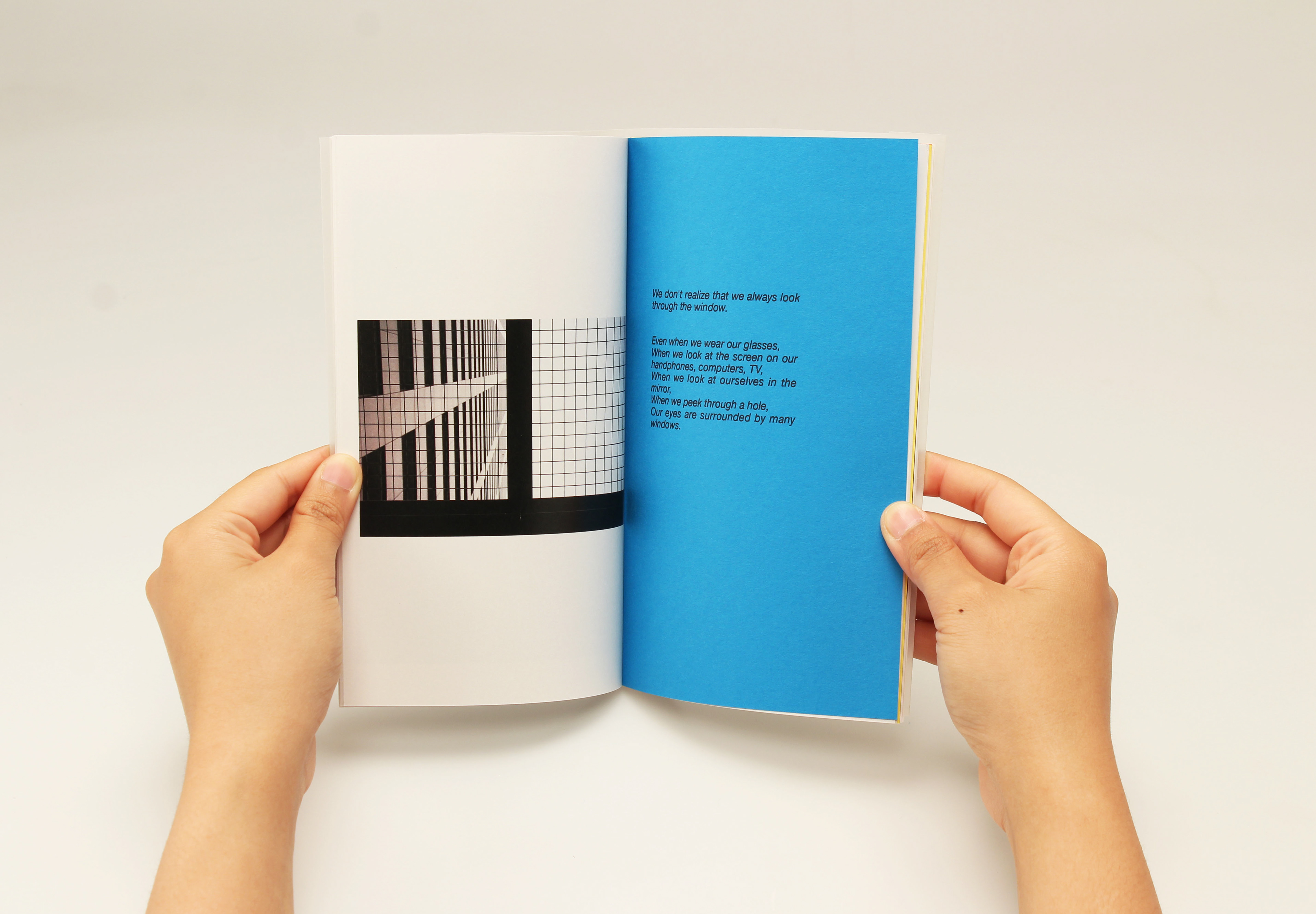 世界は広く見えて、狭い。よく考えると、人々は「枠」(□) の中に存在することが多い。メガネをかけること、携帯電話やパソコンの画面を見ること、絵画で使うキャンバスで描くことや舞台のステージで立つことなど、全ては□に囲まれている風景である。人は□の中で存在していることが不思議のように思って、実は当たり前なことを感じさせるような写真集である。